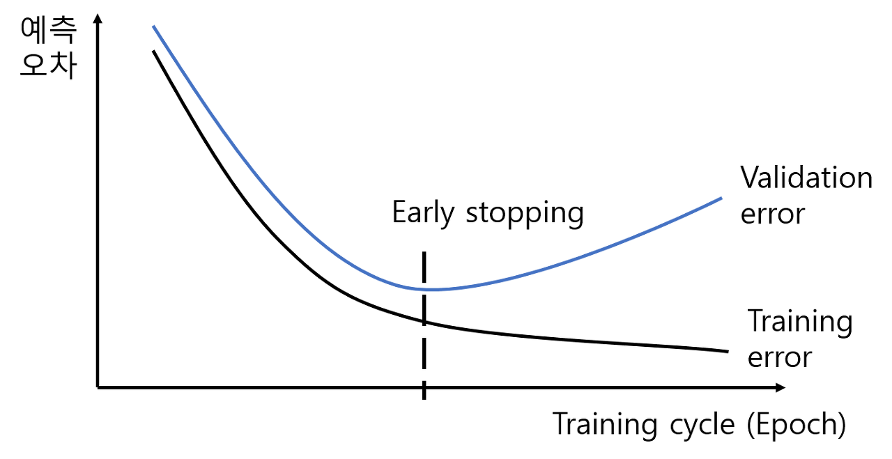 기계학습 모델링 과정에서는 학습하는 과정에서 사용하는 훈련용 데이터셋의 에러를 기록해두고, 검증용 데이터셋으로 실제 모델이 잘 작동하는지 확인하는 과정을 거치게 됩니다. 검증용 데이터셋이 에러가 감소하다가 다시 증가하는 지점. 즉, 훈련용 데이터셋에 오버피팅된 시점에서 학습을 종료시키는 방법이 Early stopping 테크닉 입니다.