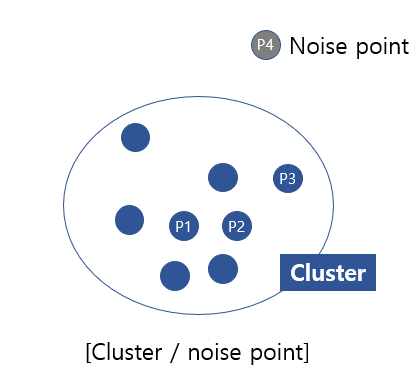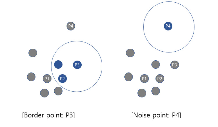 P4의 경우 어떤 점을 중심으로 하더라도, minpoints의 이상의 범위에 포함되지 않으므로 어느 군집에도 속하지 못하게 되며 이를 noise point라고 합니다.