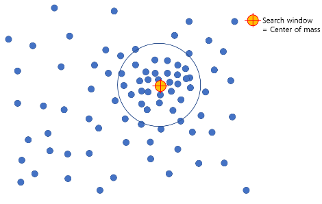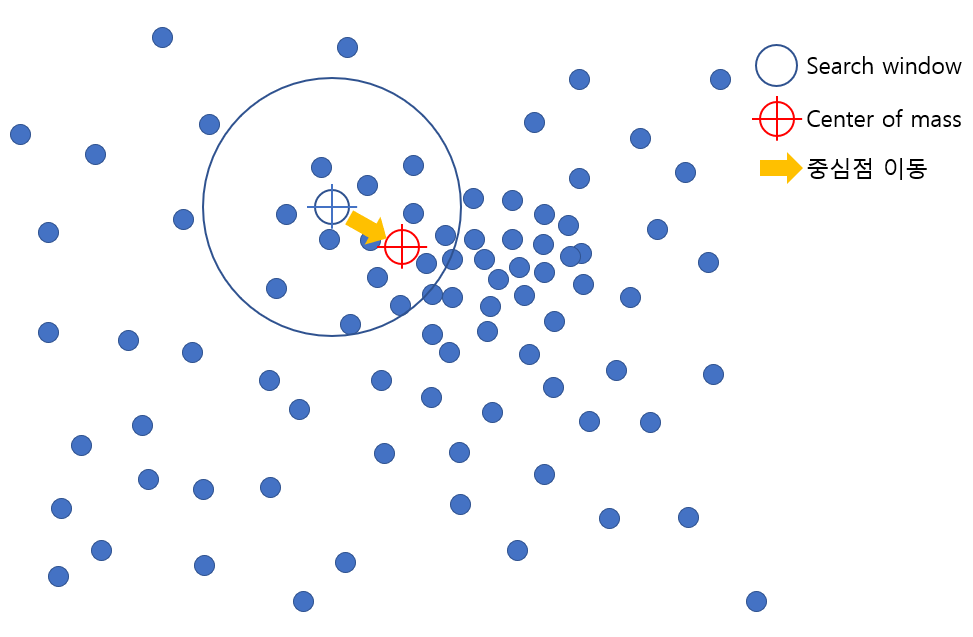 아래 그림과 같이 정해진 반지름 r을 가지는 sliding window안에서 높은 data의 밀도가 보이는 쪽으로 중심을 이동합니다.