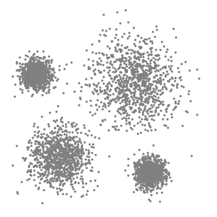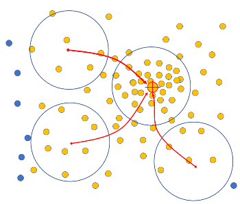 Mean-shift는 어떠한 data의 분포가 있을 때 무게중심을 찾아서, 이동하는 형태로 clustering을 하게 됩니다. 특정 data의 주변에서 data가 가장 밀집된 형태로 이동하게 되며, 단계적으로 data 분포의 중심으로 이동하면서 군집을 이루는 모델입니다.
