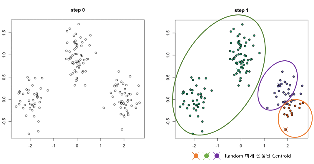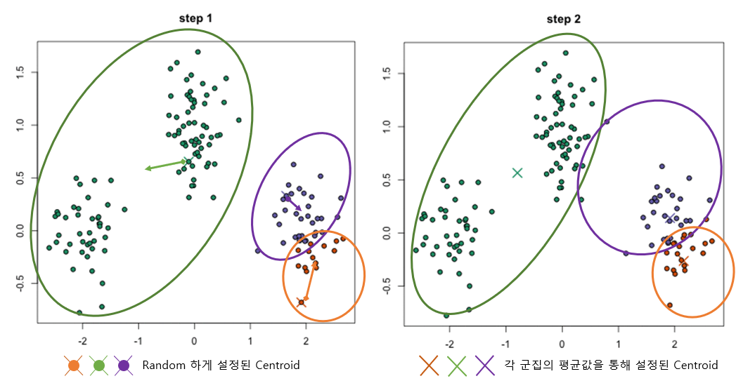 K-means clustering 모델이 구현되는 단계를 설명하자면,