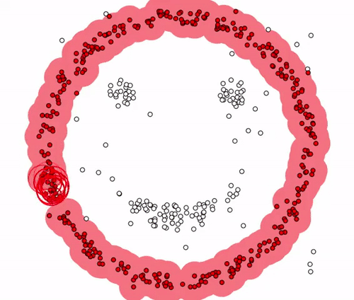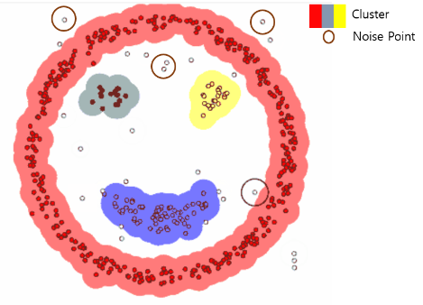 이를 반복적으로 진행하게 되면, 아래와 같이 연결된 군집 / noise point를 구분할 수 있으며,