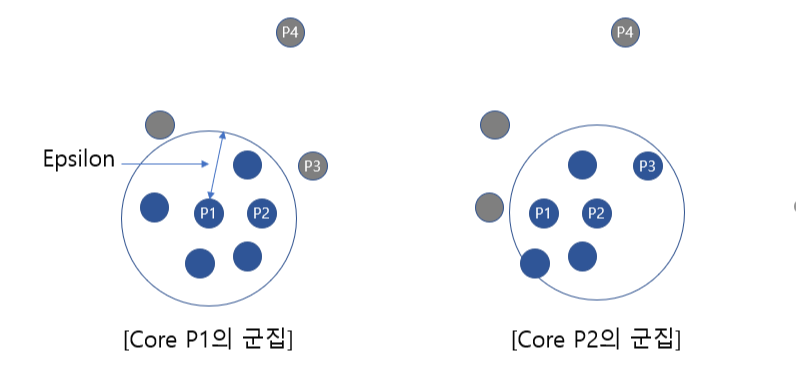 아래 그림과 같이 P1 주변의 반경 내에 minpoints = 4개 이상의 data가 존재할 경우 군집이 형성되며, P1은 corepoint가 됩니다. 또한 P2 역시 4개 이상의 data가 존재하므로 corepoint가 되며, P1과 P2는