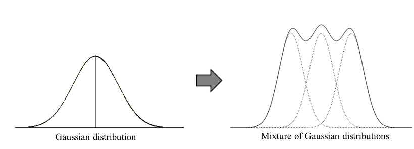 Gaussian mixture model (GMM) 이란 data point가 K개의 Gaussian 분포로 이루어져있다고 가정하는 모델입니다. 현실에 존재하는 복잡한 형태의 확률 분포를 아래 그림과 같이 K개의 Gaussian distribution을 혼합하여 표현하자는 것이 GMM의 기본 아이디어 입니다.