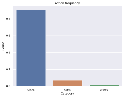 총 event 중 약 90% 정도가 click, 약 8% 정도가 cart, 나머지 약 2%가 order로 구성되어 있습니다.