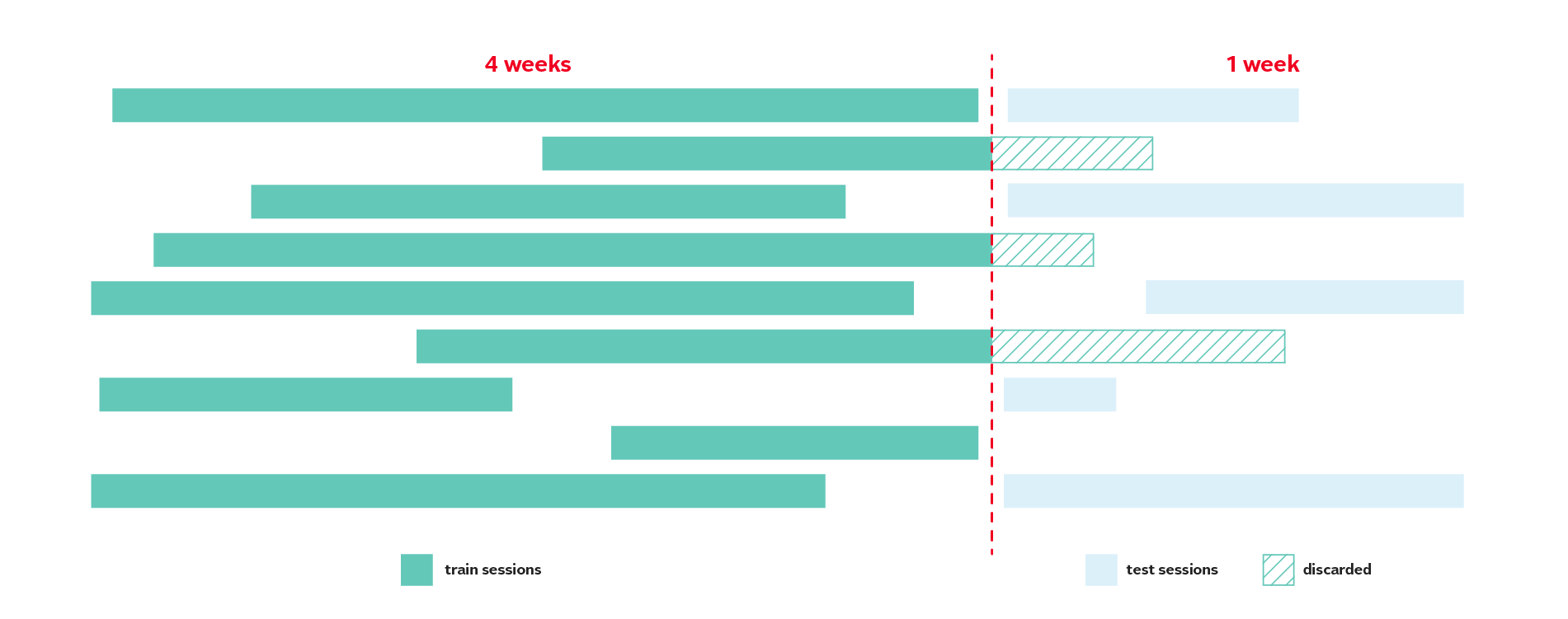 수집 기간은 22/08/01부터 22/09/04로 총 5주 입니다. 이 중 시작일로부터 4주간 관측된 데이터는 train으로, 마지막 1주 동안 관측된 데이터는 test로 제공되었습니다. 이 때 위 그림에서 볼 수 있듯이 미래 정보에 대한 유출을 막기 위해 train에서 test까지 이어진 session의 경우 test에서 제거된 상태입니다.