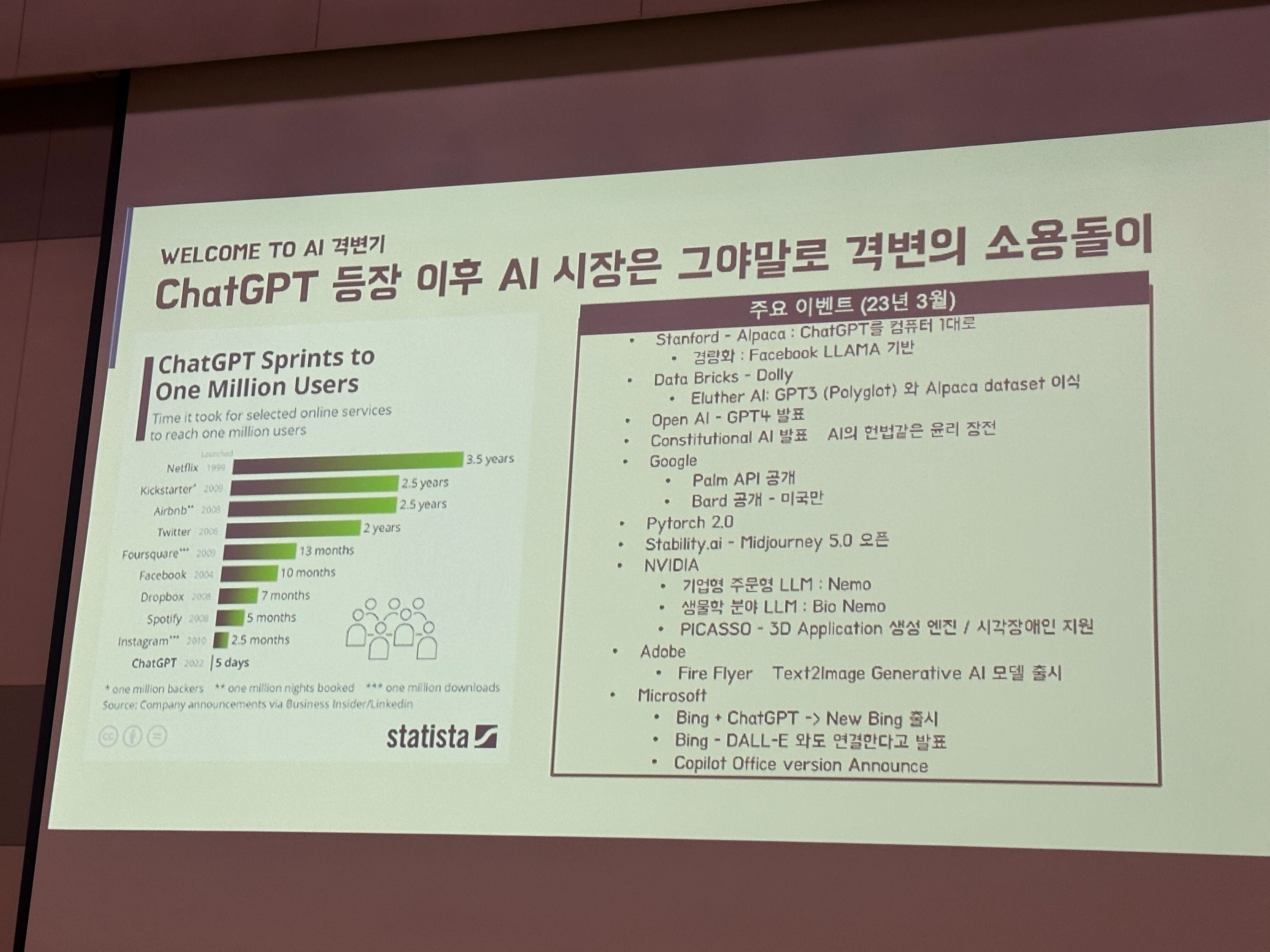 신 상무님의 세션은 ChatGPT 이후 시장이 어떤 흐름을 타고 어떻게 변하고 있는지 살펴볼 수 있는 주제로 꾸려졌는데요.
