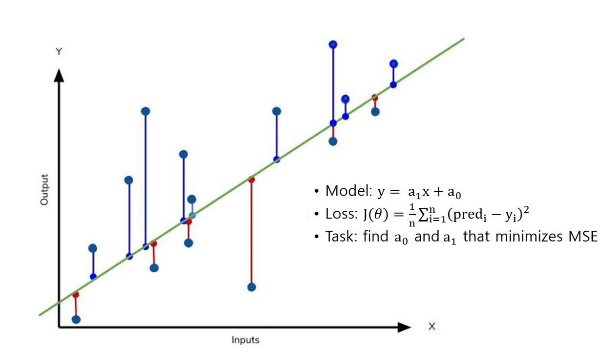 아래 그림에서 파란색 점들은 실제 관측값이고, 녹색 선은 회귀모형입니다. 회귀선과 각 관측값의 차이를 잔차(Residual)이라고 하는데, 좋은 회귀 모형은 이 잔차를 최소화하는 모형입니다. 선형 회귀에서는 손실 함수(Loss function)로 잔차의 절댓값을 더하거나(MAE, Mean Absolute Error), 잔차의 제곱을 모두 더하는 방식(RSS, Residual Sum of Square)을 사용합니다. Machine Learning에서는 RSS 방식의 평균 제곱 오차(MSE, Mean Squared Error)를 주로 사용해서 MSE를 최소화시키기 위한 a0, a1을 찾아내는 것을 목표로 합니다. MSE는 예측된 값과 실제 값의 차이를 제곱해서 평균을 낸 수치이며, 아래 식으로 나타낼 수 있습니다.