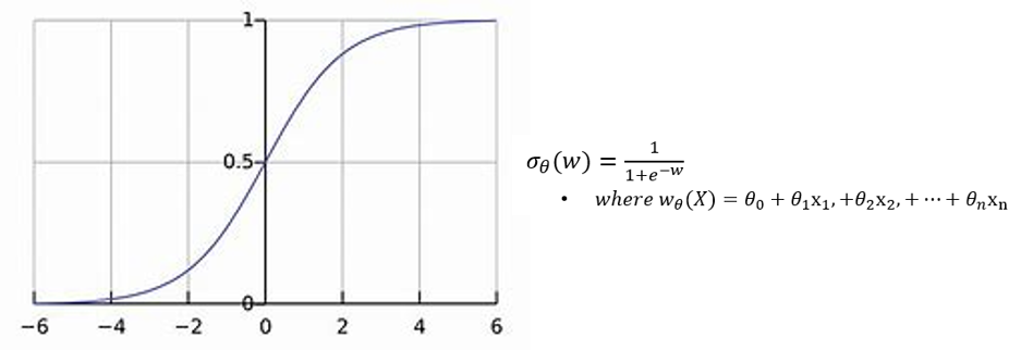 시그모이드 함수는 x 값이 커질수록 1에, 작아질수록 0에 수렴하고, 0일 때는 0.5의 확률을 가지는 함수입니다. 보통 결정 경곗값(Cutoff)으로 0.5로 설정하지만 데이터의 유형에 따라 무엇이든 선택이 가능합니다. 최적화를 위한 손실 함수는 최대 우도 추정(MLE, Maximum Likelihood Estimation)을 사용하는데, 우도(Likelihood)는 매개 변수(Parameters)의 함수로 주어진 데이터를 관측할 확률이며, 최대 우도 추정은 모형의 모수에 대한 값을 결정하는 방법입니다. 매개 변수 값은 모델에서 설명된 프로세스가 실제로 관찰된 데이터를 생성할 가능성을 최대화하도록 만듭니다. 선형 회귀와 마찬가지로 로지스틱 회귀도 임의의 초기값을 설정하고 최대 우도 추정을 점차 최적화해 나가면서 모델 성능을 높입니다.