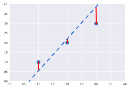 파란색 점 전체를 잘 대변하는 직선의 모습은 위의 그림에서 빨간 선(우리의 가설 직선과 실제 값의 차이)의 총합이 최소화됐을 경우일 겁니다. 손실 함수의 목적은 이 빨간 선들의 총합을 최소화하여 최적의 결괏값을 도출하는 것입니다.