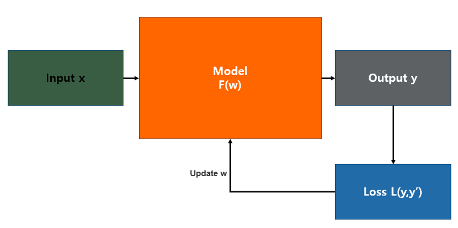 위의 그림은 일반적인 통계학적 모델의 형태로 입력 값(Input x)이 들어오면 모델을 통해 예측 값(Output y)이 산출되는 방식입니다. 그러면 이 예측 값이 실제 값과 얼마나 유사한지 판단하는 기준이 필요한데 그게 바로 손실 함수(Loss function)입니다. 예측 값과 실제 값의 차이를 loss라고 하며, 이 loss를 줄이는 방향으로 학습이 진행됩니다.