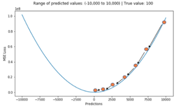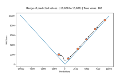 평균 절대 오차는 예측 값과 정답 값의 차이에 절댓값을 취하여, 그 값들을 전부 더하고, 개수로 나누어 평균을 낸 값입니다. 예측 결과와 정답 결과가 떨어진 정도의 절댓값을 평균 낸 것이기에, 전체 데이터의 학습된 정도를 쉽게 파악할 수 있습니다. 하지만, 절댓값을 취하기 때문에 해당 예측이 어떤 식으로 오차가 발생했는지, 음수인지 양수인지 판단할 수 없다는 단점이 있습니다. 또한 아래 그림처럼 최적 값에 가까워지더라도 이동거리가 일정하기 때문에 최적 값에 수렴하기 어렵습니다.